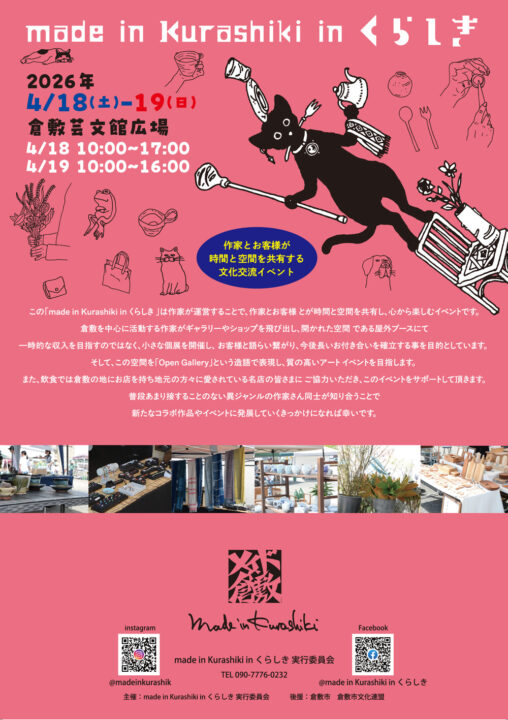 作家たちが一堂に集まり、屋外で小さな個展を開く——そんなユニークなアートイベント「made in Kurashiki in くらしき」が、2026年4月18日(土)・19日(日)の2日間、倉敷芸文館広場で開催されます。