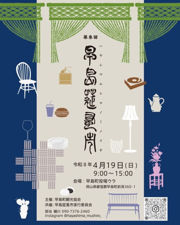 2025年の4月と9月に開催され大盛況だった「早島筵蚤市」が4月19日に早島町役場ウラで開催されます!今回もこだわりの店舗が全国から大集結しますよ~!昭和レトロをはじめとする古物・アンティークやクラフト、植物や生産者直売の農産物など幅広いジャンルが楽しめます!