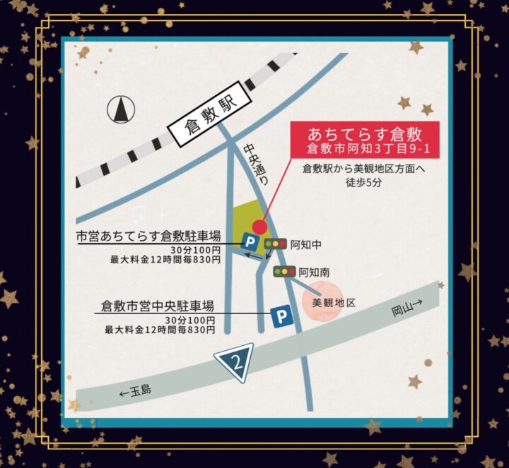 | 駐車場 | 近隣有料駐車場※あちてらす倉敷市営駐車場など |