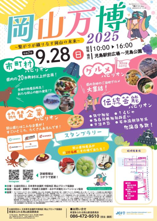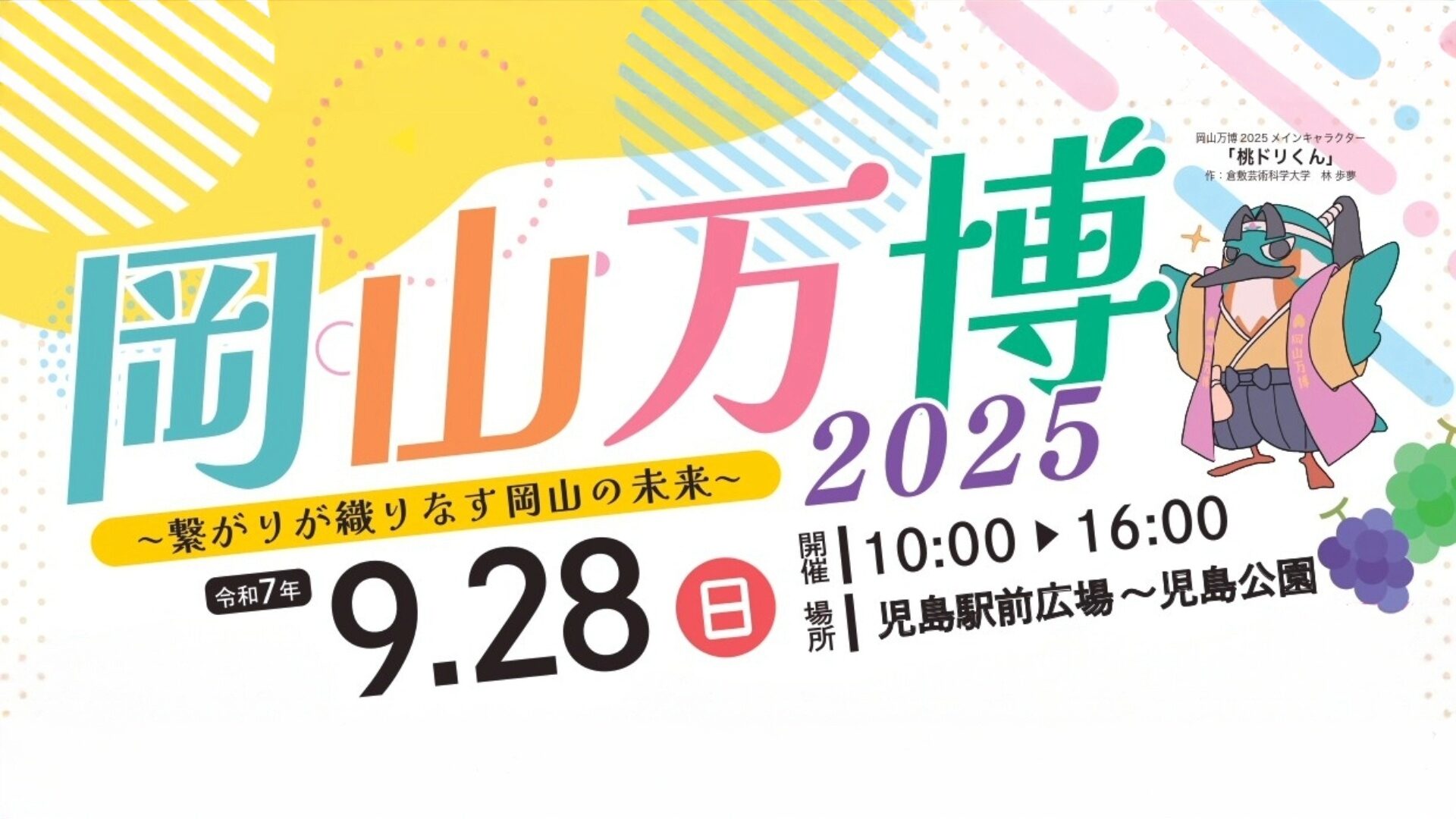 岡山の魅力が一堂に会する特別なイベント「岡山万博2025〜繋がりが織りなす岡山の未来〜」が、2025年9月28日に児島駅前広場〜児島公園にて開催されます。