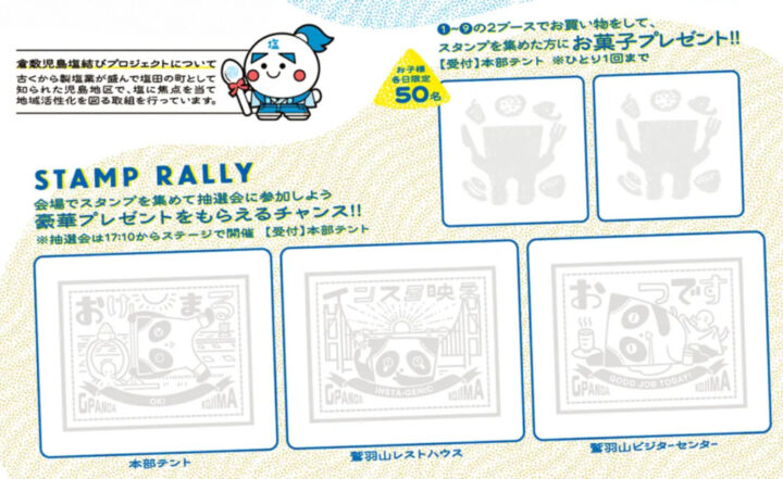また、本部テント、鷲羽山レストハウス、鷲羽山ビジターセンターの3か所にあるスタンプを集めると豪華プレゼントがもらえる抽選会に参加できます!抽選会は17時10分からステージで開催されますよ!