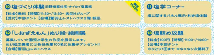 塩グルメ以外にも塩づくり体験や塩詰め放題など、塩にまつわるワークショップや体験コーナーも用意されていますよ!
