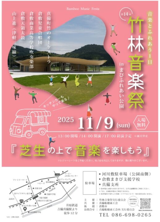 「竹林音楽祭」は平成20年から開催されているイベントで、美しい竹林から溢れる竹のパワーと音楽文化をコラボレーションし、『竹のまち真備』の魅力発信や地域活性化などを目的に開催されています。