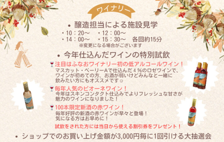 今年仕込んだワインが3種類登場するんですが、無料で試飲できるんだとか😳しかも!試飲をした方には、ワインの購入に使える割引券がもらえるそうですよ!!