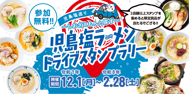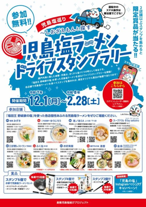 その名も児島塩巡り~しおざえもんと探す ~「児島塩ラーメン」ドライブスタンプラリー 児島塩ラーメンの魅力を広めようと、今年初開催のイベントです!
