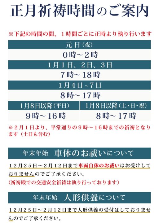 三が日のご祈祷 元日:8:00~17:00 1月2日以降:9:00~16:00