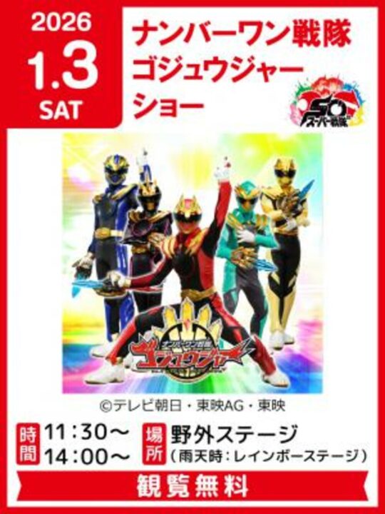 玉野市にあるおもちゃ王国では、1月2日・3日にキャラクターショーが予定されています。戦隊モノ好きには嬉しいイベントですね✨観覧無料で雨の場合も別のステージで実施されるので、親子でぜひお出かけしてみてはいかがでしょうか?