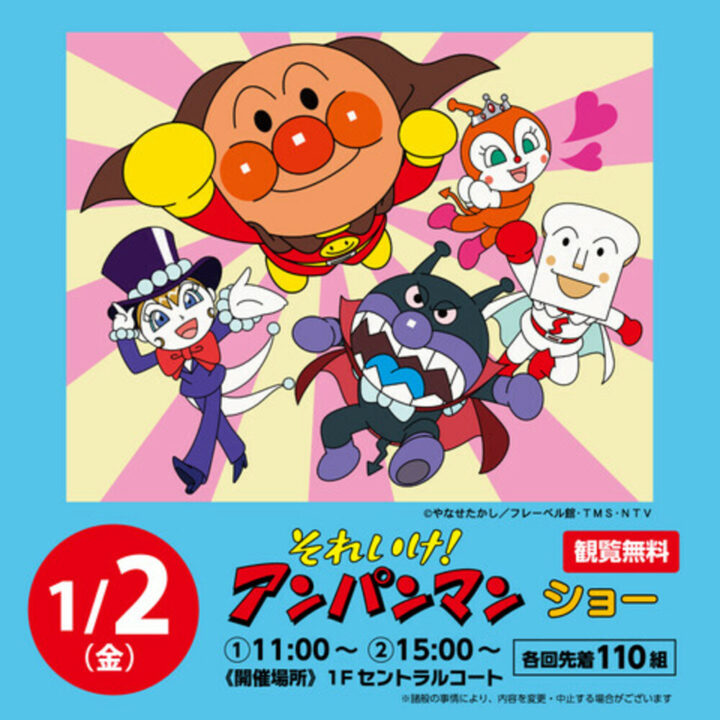 イオンモール倉敷では、1月2日に「それいけ!アンパンマンショー」が開催されます。観覧は無料ですが、観覧整理券が必要となります。当日朝8時より、専門店1F【E】入口にて全ての回の「観覧整理券」が配布されるそうですよ~!