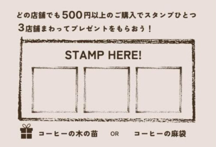 コーヒー、フード、雑貨とどのお店でも500円以上購入すると、スタンプが1つもらえます!スタンプを3つ集めると、コーヒーの木の苗かコーヒーの麻袋がもらえるそうですよ!