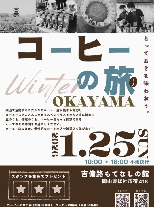 今回で3回目の開催となる「コーヒーの旅 in OKAYAMA」が、2026年1月25日(日)に吉備路もてなしの館で開催されます。