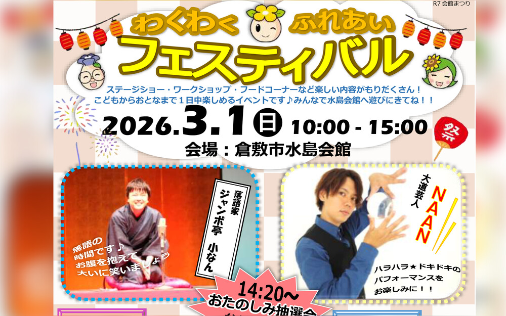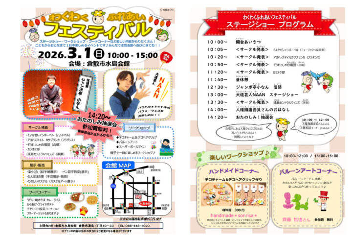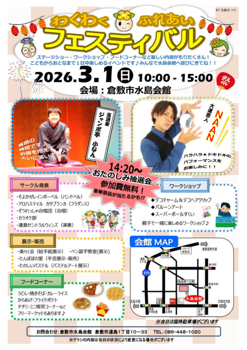 春の訪れとともに、倉敷市水島会館で心躍る1日が待っています!🌸 2026年3月1日に開催される「わくわくふれあいフェスティバル」は、親子で楽しめるワークショップ、色とりどりのハンドメイド作品、そして子どもたちが大喜びするバルーンアートまで、家族みんなで楽しめる盛りだくさんのイベントです✨