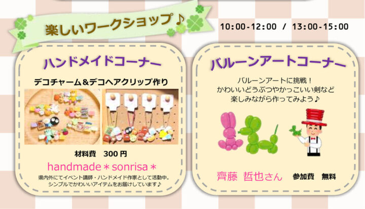 会場には、「楽しいワークショップ」コーナーが登場します🎨 チャームやヘアクリップを可愛くデコレーションするワークショップやバルーンアートに挑戦できます!手作りの喜びを感じながら、世界に一つだけの宝物を作ってみませんか?親子で協力すれば、きっと素敵な思い出になりますよ😊