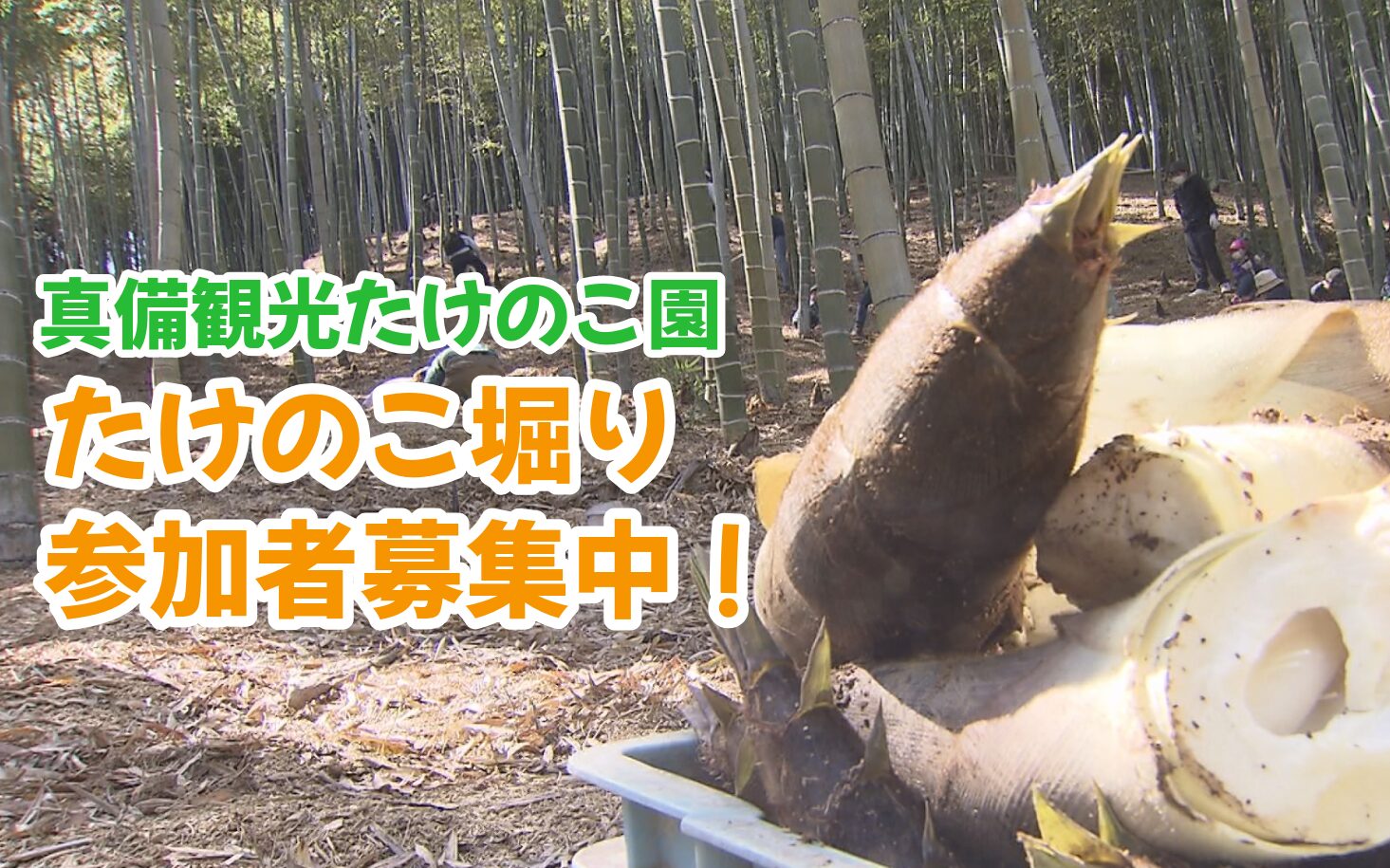 このイベントは、倉敷市真備町の特産品であるタケノコに収穫体験を通じて親しんでもらおうと、倉敷観光コンベンションビューローが地元の生産者と協力して毎年開催しています。