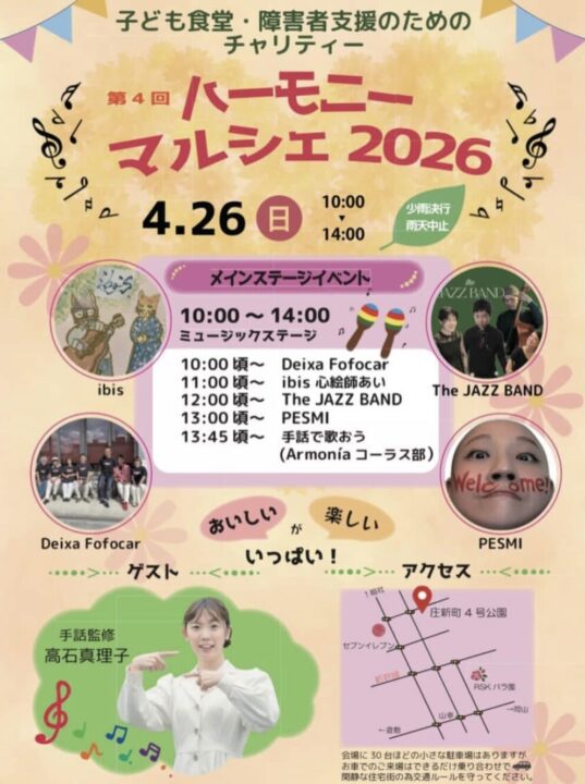 子ども食堂・障碍者支援のためのチャリティーイベント「ハーモニーマルシェ」が、今年も庄新町第4号公園で開催されます。
