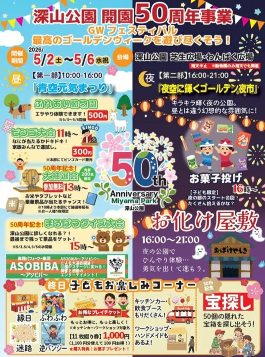 深山公園が今年、開園50周年を迎えます🎉 その記念すべき節目を盛大に祝う「GWフェスティバル」が、2026年5月2日(土)から5月6日(水・祝)までの5日間にわたって開催されます!ふれあい動物園にビンゴ大会、お化け屋敷に逆バンジーまで、朝から夜まで楽しいコンテンツが目白押し。今年のゴールデンウィークは、深山公園に集合です😆