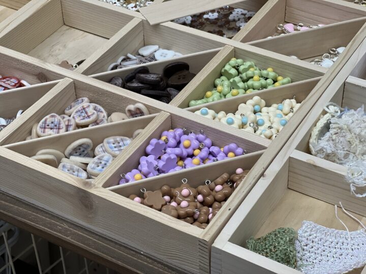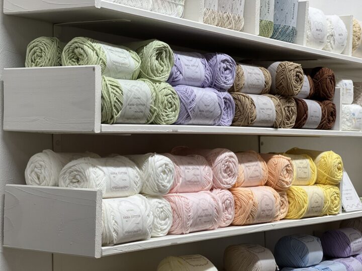 プラムべべの特徴の一つは、通常インターネット販売が中心の韓国資材を実際に手に取って確認できること。毛糸一つとっても、デザイン性や種類が豊富で、ハンドメイド好きにはたまらない品揃えです 🧶🧵