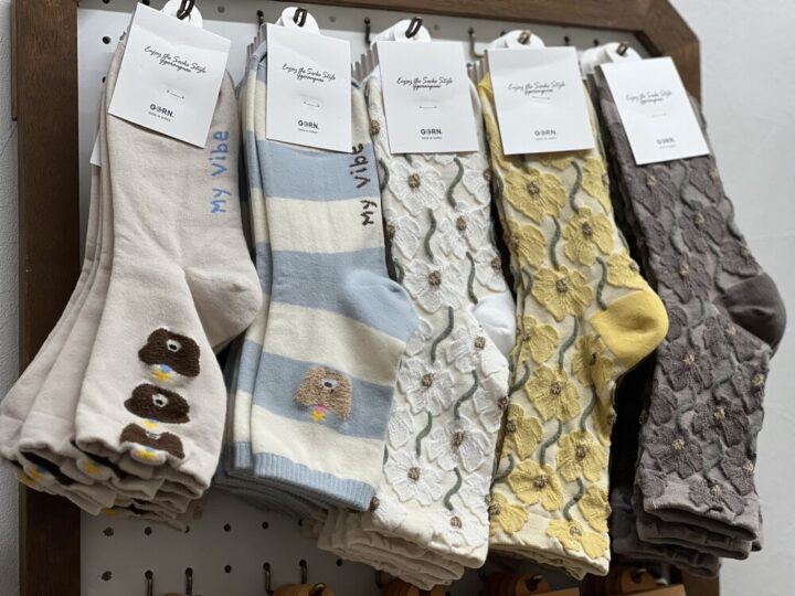 さらに、店舗で販売されている韓国の靴下はオーナーが直接韓国へ足を運んで仕入れたこだわりの品々です。インターネットでは分からない質感や色合いを実際に確かめられるのは、実店舗ならではの魅力ですね 🧦