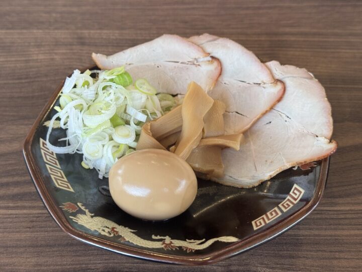 半熟煮卵子・天然岩のり・ネギ盛り・シナチク盛り・海苔・チャーシュー増し