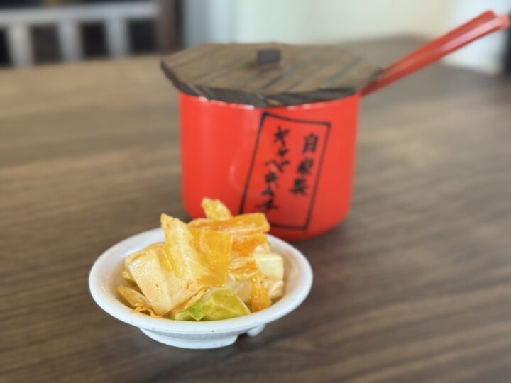 ラーメン屋でよく見かけるサービス品はもやしナムルや高菜ですが、こちらでは自家製のキャベツキムチを提供!
