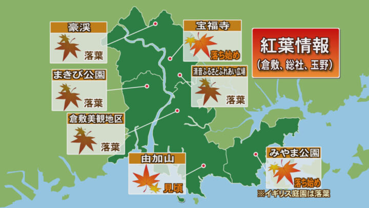 多くの場所で落葉が始まったよ!宝福寺や由加山は見ごろを迎えているよ!映像はこちら(KCTニュースより)