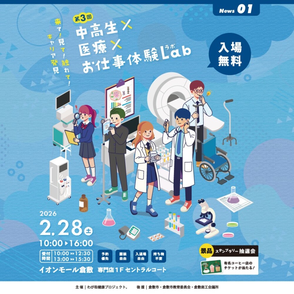 「わが街健康プロジェクト。」主催の中高生を対象に開催するイベント「来て!見て!触れて!キャリア発見 中高生×医療×お仕事体験Lab」がイオンモール倉敷で開催されます。