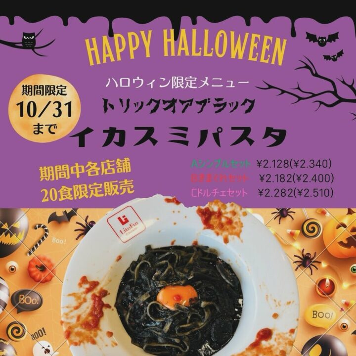 倉敷市中庄のリトファンイタリアーノでは、10月31日までの期間限定でハロウィン特別メニュー「トリックオアブラック イカスミパスタ」が登場します。イカスミで真っ黒に染められたパスタは、その独特の見た目から思わず二度見してしまうほど 👀