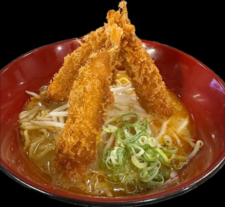 「グリルまつしま」で提供されるラーメンは「えび味噌ラーメン」と「和風醤油ラーメン」の2種類。どちらも900円で、特徴的なのは大きな海老フライがトッピングされている点です!🍤