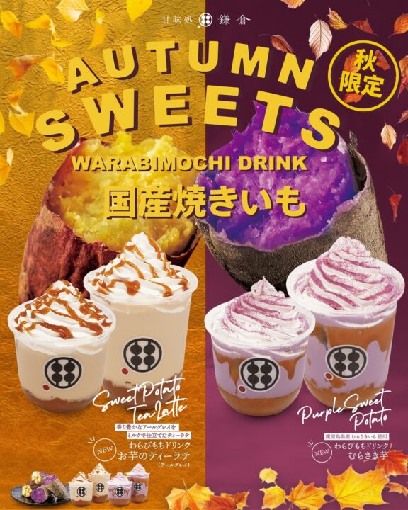 「甘味処鎌倉」では、この季節にぴったりの「わらびもちドリンク むらさき芋」と「わらびもちドリンク お芋ティーラテ(アールグレイ)」がお目見えしました。