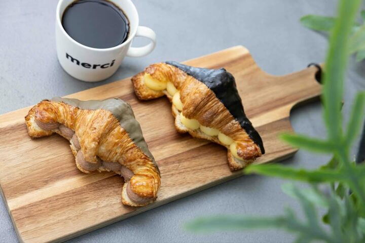 写真左の「マロンとほうじ茶のエクレアクロワッサン(399円)」と写真右の「美作ほうじ茶クリームクロワッサンブリュレ(349円)」です✨