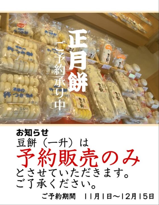 特に「豆餅(一升)」は予約限定販売となっているので、ご希望の方はお早めにご予約を🙏