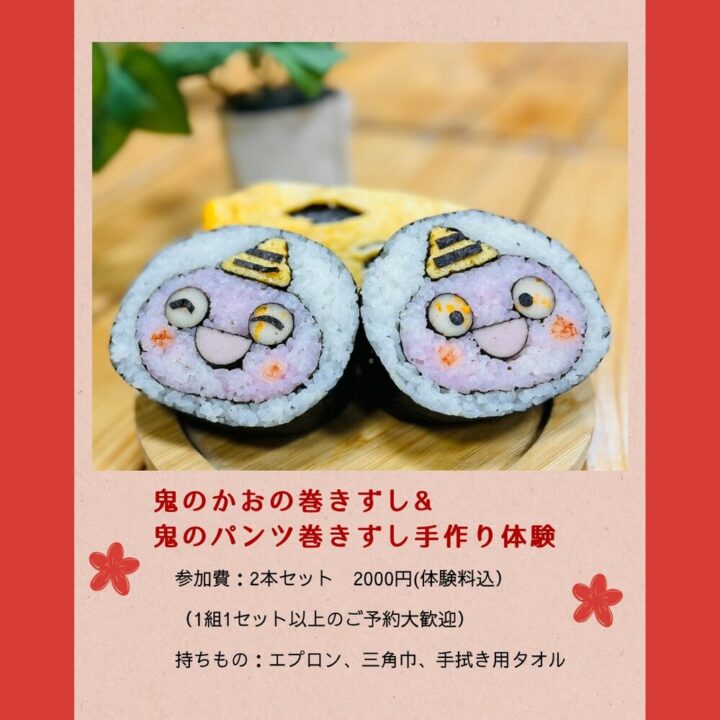 巻き寿司体験では、鬼の顔の巻き寿司と鬼のパンツ巻き寿司の2種類(各10cm)を作ることができますよ~💗