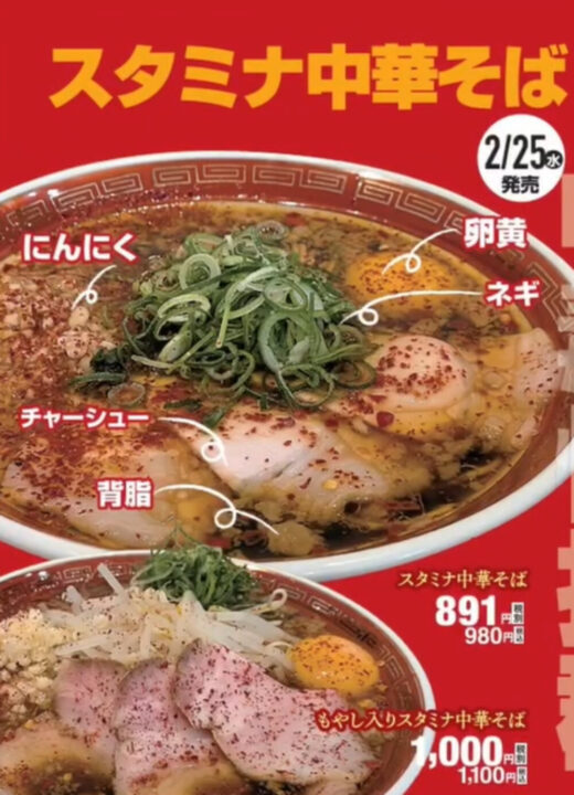 2026年2月25日(水)から発売の新メニュー「スタミナ中華そば(980円)」です。