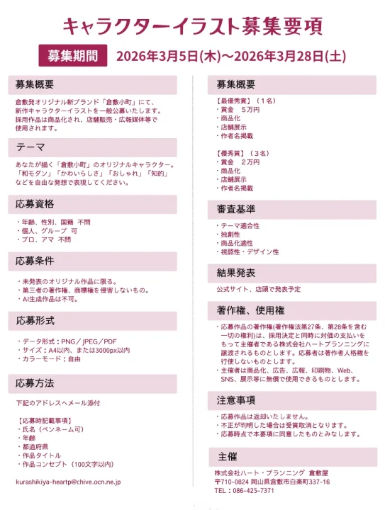 倉敷発のオリジナルブランド「倉敷小町」が誕生するということで、新作のキャラクターイラストが一般公募されていますよ~!