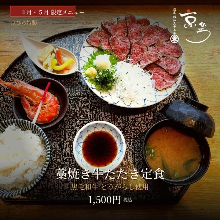 もう一つの注目メニューが、4月・5月限定の「藁焼き牛たたき定食」🥩。黒毛和牛のとうがらしを豪快に藁で焼き上げた自慢の一品で、とろけるような柔らかさと藁の香りが絶妙なハーモニーを生み出します。